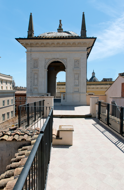 The exterior has also been carefully restored. The plasterwork and stucco have been consolidated, the capitals have been rebuilt in continuity with those already redone in 2016, and the string course cornice is once again visible with its faux marble decorations. The travertine balustrade has been cleaned and integrated where necessary. In addition, the floor adjacent to the entrance to the roof terrace has been structurally reinforced and transformed into a panoramic terrace with a new protective railing.
