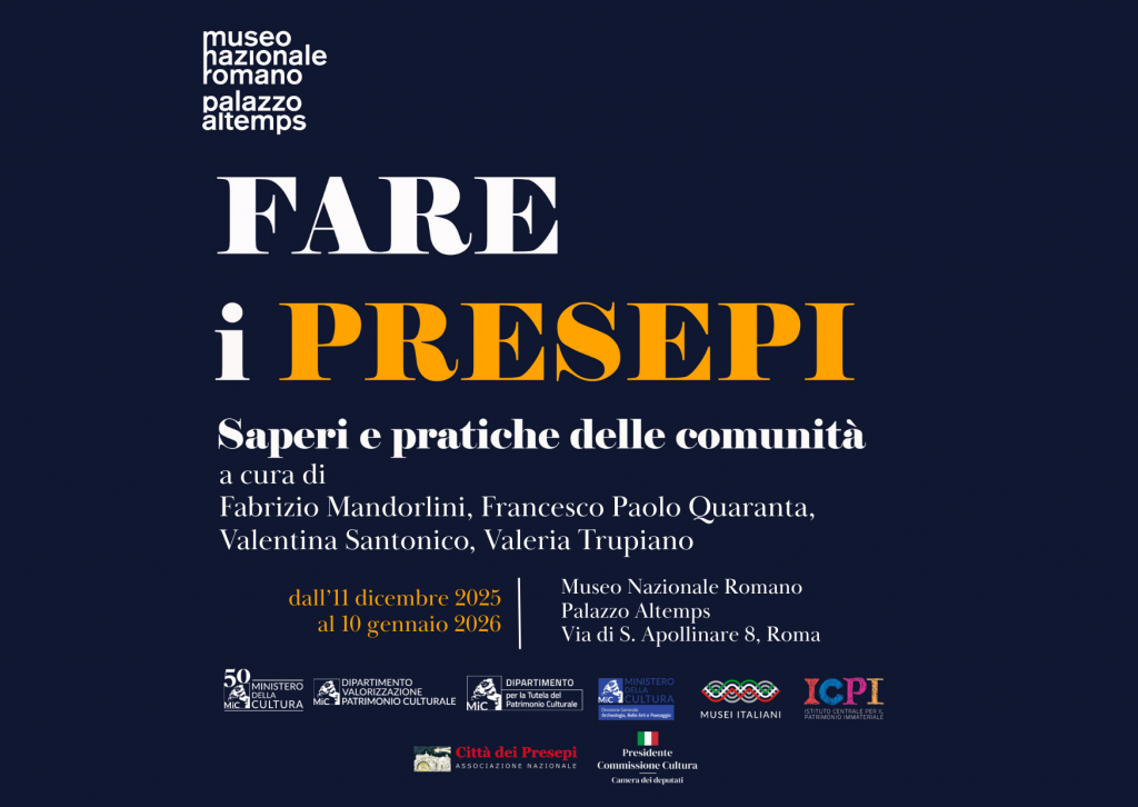 Apre domani, 10 dicembre 2025, la mostra Fare i presepi. Saperi e pratiche delle comunità, organizzata e promossa dall’Istituto Centrale per il Patrimonio Immateriale e l’Associazione Nazionale Città dei Presepi, in collaborazione con il Museo Nazionale Romano – Palazzo Altemps, e con il supporto della Direzione Generale Archeologia, Belle Arti e Paesaggio e della Commissione Cultura, Scienza e Istruzione della Camera dei Deputati, che sarà visitabile fino al 10 gennaio 2026 nei normali orari di apertura del Museo, dal martedì alla domenica, dalle 9.30 alle 19.00.