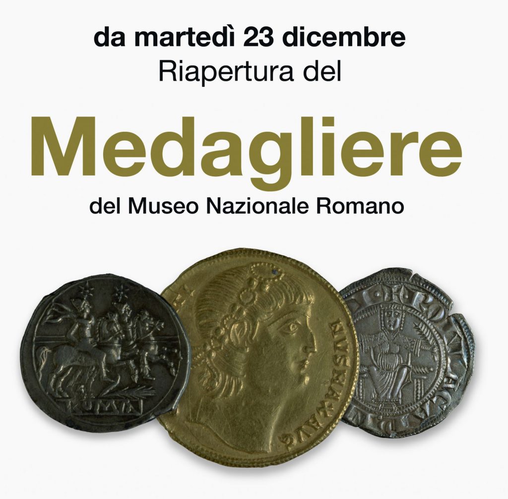Dopo sei anni di chiusura dal 23 dicembre 2025 il Medagliere del Museo Nazionale Romano riapre al pubblico. Le sue origini risalgono alla fase costitutiva del Museo stesso: inizialmente collocato, agli inizi del Novecento, in alcuni ambienti delle Terme di Diocleziano, dal 1996 il Medagliere ha trovato sede stabile a Palazzo Massimo alle Terme. In esso confluiscono due anime: i materiali numismatici “da scavo”, per la maggior parte provenienti dal territorio di Roma e del Lazio, rinvenuti in occasione dei lavori di adeguamento urbanistico della nuova capitale del Regno d’Italia e di sistemazione dell’alveo del Tevere; e i materiali numismatici “da collezione”, esito di donazioni, acquisizioni, come quelli provenienti dal Museo Kircheriano (che comprende la raccolta delle varie serie in bronzo fuso romane e una raccolta di medaglie e moltissime monete, tra le quali si ricordano le migliaia rinvenute nella famosa stipe di Vicarello, località sulle rive del lago di Bracciano nei pressi di Roma), di raccolte private, tra cui le più note sono la collezione di oltre 20.000 monete di età romana di Francesco Gnecchi appassionato collezionista milanese, tra cui spicca il pezzo unico da tre solidi del re ostrogoto Teodorico, e la collezione di circa 120 mila monete italiane di età medievale e moderna di Vittorio Emanuele III di Savoia.