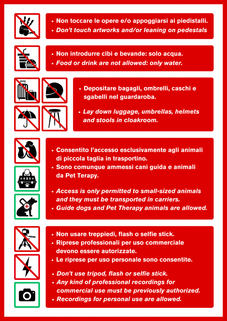 Si ricorda che è vietato accedere alle sedi museali con zaini ingombranti, trolley o ombrelli.